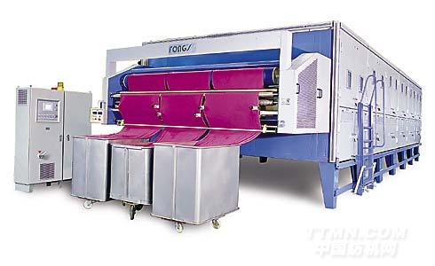 織物喂進網(wǎng)狀運輸帶。喂布時有點超喂量。運輸帶將織物送入烘干箱。上下兩層錯開的噴咀將熱風噴出。當熱風噴到織物表面時,織物形成波浪。熱風將織物內(nèi)水份蒸發(fā),少部份的蒸氣被排出機外。濕度控制器檢測排氣的濕度以保證系統(tǒng)有效使用能源。蒸氣或熱油可以是間接熱源而天然氣或煤氣可以是烘干時的直接熱源。非接觸式溫度檢測儀監(jiān)控織物表面溫度以保證織物不會過度加熱及有效使用能源。烘干后的織物通常搖折在載布車。