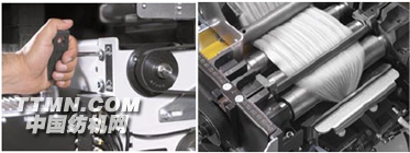 立達4上 下牽伸系統是并條機的核心技術。在主牽伸區,帶有高精度溝槽的下羅拉和特殊形狀的壓力棒確保精確的纖維引導。幾何形狀和下羅拉軸承方面所具有的優勢允許可采用比其它并條機更小的羅拉隔距,確保加工短長度棉纖維或落棉時良好的加工性能,并為經濟地利用原料創造了潛力。