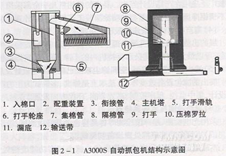 主要特點(diǎn):輸棉槽覆蓋帶兩端固定,中間導(dǎo)輪排列呈Ω形,覆蓋帶只跨過導(dǎo)輪,輪子動(dòng),而覆蓋帶不隨機(jī)臺(tái)走動(dòng),只經(jīng)中間導(dǎo)輥處作上下移動(dòng)。不易損壞。保養(yǎng)容易,節(jié)約動(dòng)力。打手單點(diǎn)排列成螺旋狀,小棉束均勻抓棉??偪刂婆_(tái)上的液晶顯示屏,可提供各種運(yùn)轉(zhuǎn)數(shù)據(jù)、故障顯示。一旦該控制系統(tǒng)發(fā)生問題,可以直接由主機(jī)自動(dòng)操作,不會(huì)影響生產(chǎn)。 A3000S自動(dòng)抓包機(jī)結(jié)構(gòu)示意圖見圖2—1。.jpg)