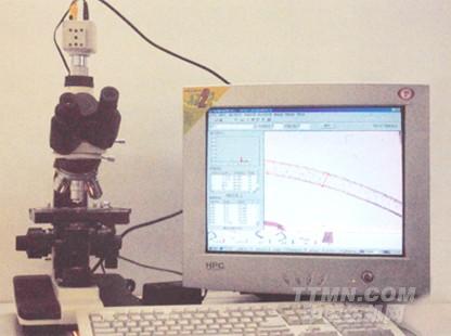本系統從光學系統來獲得圖像,將被測物體放在顯微鏡的載物臺上,CCD用來代替顯微鏡的目鏡,CCD的視頻線接在大恒圖像卡上的復合輸入視頻線的一根上。打開顯微鏡的光源,調整焦距,得到一個清晰的像,CCD攝取圖像,通過視頻線傳到圖像卡中,經過A/D轉換,將圖像顯示在屏幕上,通過圖像的測量軟件可以開始測量,可以得到測量的數據、紗線的平均直徑、紗線的變異系數以及紗線的誤差。