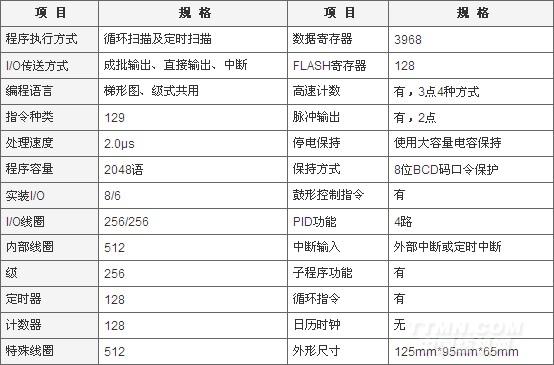 具有DC輸入的PLC,可設定其3個輸入點(I0-I2)為高速輸入點;更 可設置PLC具有外部中斷,脈沖捕捉,輸入濾波功能。 高速計數最高速度為5Kcps;脈沖捕捉最窄脈寬0.1ms;輸入濾波 最大時間99ms