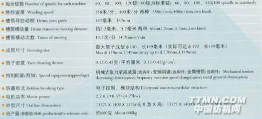 該機適用于工業縫紉線,輪胎簾子線,傳動帶粘合線,魚網用線,箱包線,背包用線,擴地毯紗,雪尼爾線等不同紗線的絡筒或繞成松軟的筒子供染色使用,也可以定制為反2-3根纖維并合卷繞成并紗筒子。