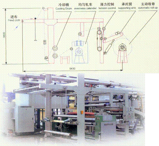 本機(jī)有進(jìn)布機(jī)架,冷卻桶,均勻軋車(chē),漲力控制器,承托臂,主動(dòng)收卷等組成。