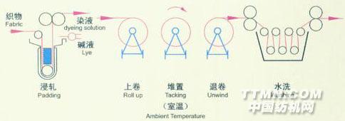 此工藝特點(diǎn)是:連續(xù)式軋染,間隙式堆置固色,染液和堿液分開(kāi)配置。在染色時(shí),用比例泵將染料和堿劑按比例混合(4∶1)后注入軋車(chē)染液槽中。染料和堿劑混合時(shí)間短,染料水解少,染浴穩(wěn)定性良好。