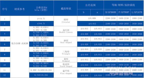 注: 1、刷用鋼絲采用油回火鋼絲,具有與優異的抗疲勞性能; 2、根據表面色澤分光亮鋼絲、鍍鋅鋼絲和發藍鋼絲; 3、L為普通級,P為高耐磨,D為超高耐磨;