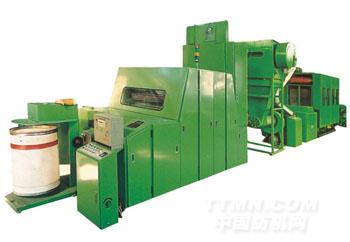 該設備是將晴綸、滌綸、棉及其它化纖合成原料,通過喂毛機初步開松,輸送至開松機,開松后通過梳棉分機送至凝棉器進行除雜、除塵,然后通過自調勻整棉箱喂入梳理成條,進一步除雜,梳理成條干均勻、具有一定重量的毛條供下道工序使用。