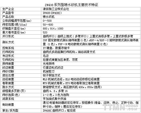 ZW408型噴水織機是津田駒工業株式會社在ZW405型噴水織機的基礎上改進型。孳生型還有ZW408C型。 適織品種 從一般面料到中等厚重的高附加價值織物。 主要結構 有高度剛性的兩側箱型機架,可以減輕高速運轉時的振動。由于振動的減輕,可以實現進一步穩定的引緯和打緯運動,從而保證織物的高品位。 主要的驅動部分是安排在油浴的環境中,從而實現了進一步穩定的高速運轉。 穩定的引緯性能和軟投緯 采用了提高噴射水流集束性的新型噴嘴,實現了小開口時的引緯。另外,即使在超高速運轉中也可以只使用少量的噴射水,從而實現了有益于緯紗的軟引緯。不僅可以提高織物的品位,還可以減少水的消耗。 穩定的織口 采用了強韌的機架結構和高剛性的送經、卷取機構,使織口位置更加穩定,從而織造范圍也從輕薄織物到中等厚重織物,從低密度織物到高密度織物,得到了大幅度的擴大。即使裝載多臂運轉時,振動也可以控制得很輕微,所以組織復雜的織物和不平衡組織織物,都能夠穩定地織造。 從容的引緯 通過打緯曲線的改進,加大了緯紗飛行角度。從而使粗支強捻紗和新合纖的引緯更加穩定,可以織造出高質量的差別織物。同時,經紗開口不夠穩定的織物或者容易發生經紗松弛的織物的織造效果,也得到了大幅度的改善。 PF型噴嘴 在以往的P型噴嘴的基礎上作了改進,進一步提高了噴射水的集束性,實現了較小開口和較少水量中的穩定運轉,以及即使在高速運轉中也能夠有益于經紗和緯紗的軟引緯。特別是在單色塔夫綢的高速織造中,能夠在提高織物質量方面發揮巨大的威力。 SDP測長儲緯裝置 新型SDP是單色專用的測長儲緯裝置。因為不需要儲留緯紗的鼓風機,所以能夠大幅度地節省能源。而且賦予緯紗的張力較小,測長量的誤差也可以控制在最低水平。由于引緯時的氣圈狀態的改善,適用紗的范圍也得到了明顯的擴大。 RDP~A測長儲緯裝置 因為賦予緯紗的最大張力較小,在單色織物的高速織造中,也能夠保證織物的高品位。不用說常規紗,即使是加捻紗、塔斯綸紗、粒結花線、起圈花線等,各種差別化織物均能適應。 OPF光電探緯器 結構簡單且小巧的光電探緯器,可以準確無誤地探測從原紗乃至強捻紗,從細支紗乃至粗支紗,實現高速、穩定的運轉。 FDP—H測長儲緯裝置 以電腦控制而且操作簡便的新型FDP—H,考慮了減小儲留緯紗的張力,因此可以實現從纖細的細支紗、無捻紗乃至粗支紗、強捻紗的穩定儲留。 電動夾絲器、電磁轉換閥等的控制,可以與儲緯器的停緯銷定時一起,在IT鍵盤上輸入和管理。 儲緯器頭部的調節,不論從軟件和硬件方面都更加簡便,同時還提高了高速追從性。還裝備了解舒傳感器和儲緯器上的斷緯傳感器,可以實現進一步高品位的織造。 2C噴嘴隔板 可以使從噴嘴部露出的緯紗前端穩定,從而防止緯紗與緯紗的相互纏結。 超啟動電動機 超啟動電動機,實現了織機啟動轉矩的超高倍率化。可以防止停車檔和投第一緯時的緯紗松弛。直接連接在曲柄軸上的大容量電磁制動器,實現了織機準確的定位停車。 織物的送經 得到加強的齒輪箱和雙輥送經,適合于輕薄到超厚重的織物,并可以提高織物的品位。不論是配有環錐式變速機的MLO機械式送經,還是操作簡便的EL0電動送經,在防止停車檔方面均萬無一失。 WBS緯紗制動 大幅度地減小投緯結束時發生的峰值張力,可以使高速運轉時強捻紗織物的皺紋均勻。還可以防止低彈絲一類的織物在織造時的緊緯和松緯。 3色自由選緯 3色自由選緯與雙泵的配合,能夠適應不同種類不同支數的織物,可以進一步擴大織造范圍。 電動式緯紗拉回裝置 在織造一部分織物時,將從噴嘴部露出的緯紗前端向回拉直,從而防緯紗與緯紗的相互纏結,使引緯更加穩定。 雙泵 將紗支粗細或者特性差異較大的兩種緯紗,以最佳的引緯方式來配合,從而實現穩定的高速運轉。適合于不同種類、不同紗支的高附加價值織物的高速穩定運轉。 2色擺動式噴嘴 具有獨特結構的擺動機構可以使各噴嘴在最佳的位置引緯,從而使織機運轉更加穩定。而且打緯沖程可以和單色時一樣短,所以能夠減小振動和電耗,有利于高速運轉。 CCL無捕緯邊紗 通過設置于織物外邊的嘴子,不使用捕緯邊紗做出噴嘴對面一側的布邊。可以避免起因于捕緯邊紗的故障,提高運轉效率。 紗端處理紗單獨驅動裝置 紗端處理紗以專用的桿開口。多臂框架可以全部用于布面織造,同時還有利于高速化、擴大織造適應范圍和節能。 彈力絲專用裝置 噴嘴一側的捕緯器可以調節握持力,以防止緯紗從噴嘴脫出。噴嘴對面一側的張力板可以保持緯紗的張力,從而以穩定的狀態織造出均勻的彈力織物。 前面布經路傾斜型 通過使從織口開始的布經路傾斜,在織造雙重織物等不平衡組織織物時,也能夠避免發生織口的上下移動,實現穩定的織造。 接觸式IT鍵盤(選購件) 新開發了接觸式IT鍵盤。在IT鍵盤上可以集中地進行ELO電動送經、ETU電動卷取以及FDP—H電動鼓筒儲緯等的設定,防止停車檔的設定也變得更加簡便。還可以進行織機運轉狀態的監視。