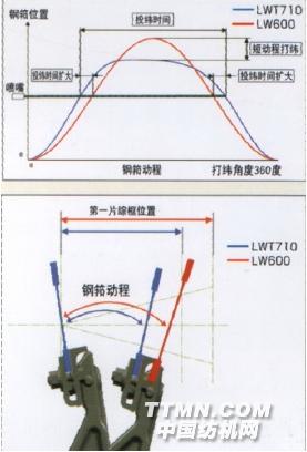 b.采用短動程打緯,同時兼顧了引緯時間和打緯性能,縮短織口到綜框的距離,有利于高支高密織物織造。新老打緯機構動程對比見圖 5—26;