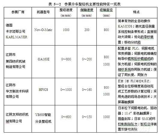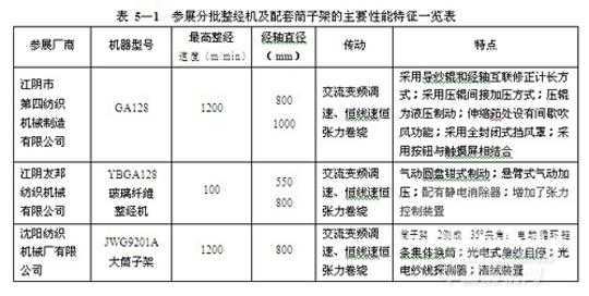 本屆展覽會實物參展的分批整經(jīng)機有江陰四紡機 和江陰市江陰友邦紡織機械有限公司 整經(jīng)機頭各1臺、沈陽紡織機械廠有限公司 大筒子架1臺。其他均以樣本的形式展出,產(chǎn)品型號與上屆基本相同,技術上變化不大。實物參展分批整經(jīng)機的主要技術參數(shù)及其特點見表 5—1。