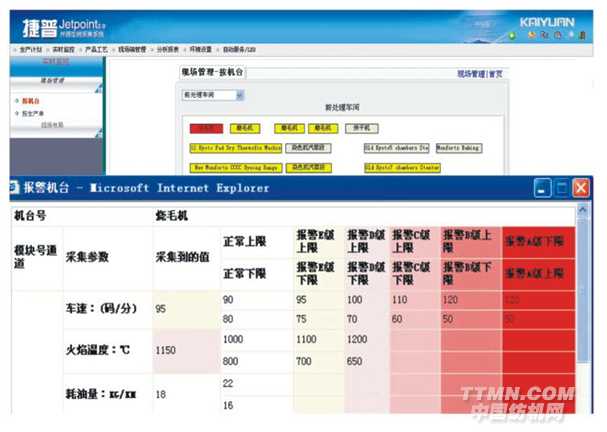當(dāng)機(jī)臺異常運(yùn)轉(zhuǎn)、工藝參數(shù)超過正常范圍時,系統(tǒng)將立即反應(yīng),通過聲光報警裝置提醒現(xiàn)場操作人員及時進(jìn)行調(diào)整,同時通過網(wǎng)絡(luò)將異常情況發(fā)生的機(jī)臺和參數(shù),通報生產(chǎn)管理人員。