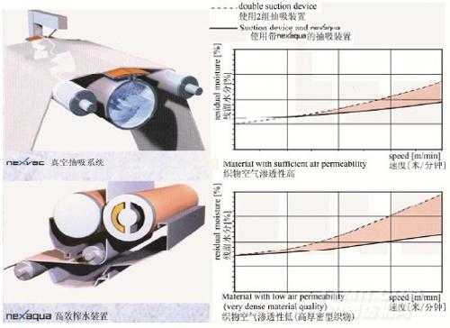 寇司德的高效軋水裝置(Nexaqua)純熟地運用了其均勻輥技術,與抽吸裝置組合,可極大地降低殘留水分,尤其適于高速生產的濕法工藝和水刺工藝。其與一般真空抽吸系統的脫水效果對比見圖 1。