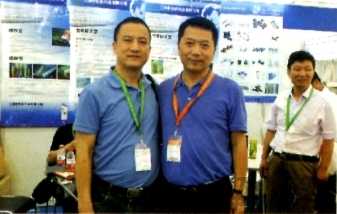圖為江陰長紡科技有限公司董事長徐正堅(左一)和河南天星紡織有限公司董事長張勇在展位前合影。