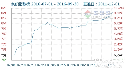根據生意社紡織指數顯示,在經歷8月短暫回調后進入9月份國內紡織市場行情繼續呈現上行態勢,截止30日紡織指數為822點,創下年內新高,較月初801點上漲了2.62%,同比漲幅10.78%。較周期內最高點1074點(2013-02-19)下降了23.46%,較2016年02月17日最低點715點上漲了14.97%。(注:周期指2011-12-01至今)