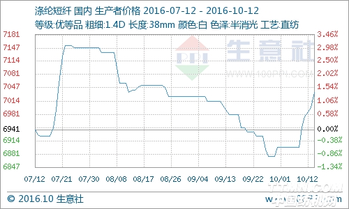 據生意社價格監測顯示,10月12日滌綸短纖價格上漲,目前1.4D*38mm的滌綸短纖市場均報價在7036元/噸,較上一日上漲了0.56%,同比上漲0.35%。