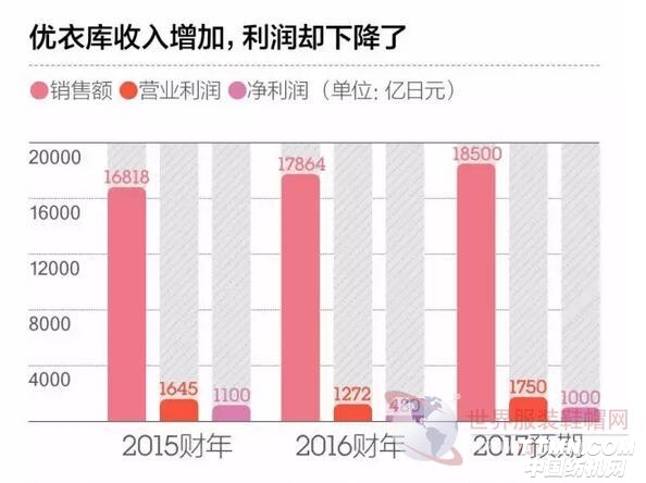 優衣庫母公司迅銷集團2016財年總收入約1.79兆日元(約合1155億元人民幣),比上年度增長6.2%。但營業利潤與凈利潤雙雙下降——營業利潤為1272億日元(約合82億元人民幣),比上年下降22.6%。凈利潤480億日元(約合31億元人民幣),比上年下降56.3%。