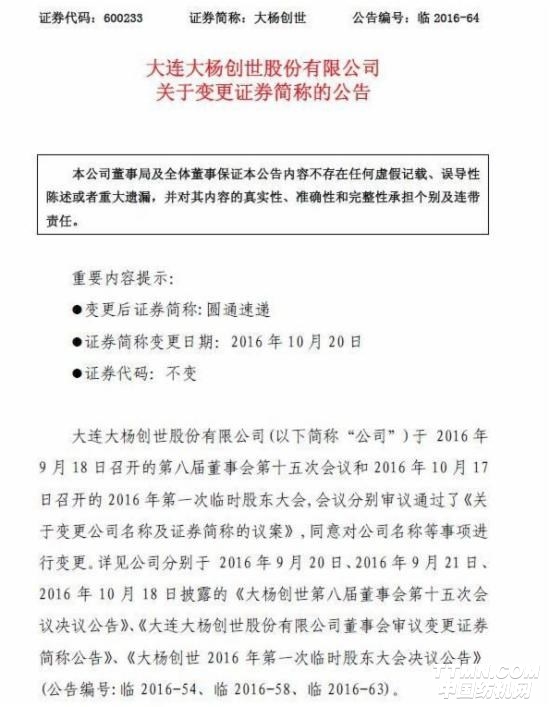 大楊創(chuàng)世昨日晚間發(fā)出公告稱,經(jīng)公司申請(qǐng)并經(jīng)上海證券交易所核準(zhǔn),公司證券簡(jiǎn)稱自2016年10月20日起由“大楊創(chuàng)世”變更為“圓通速遞”,公司證券代碼“600233”不變。