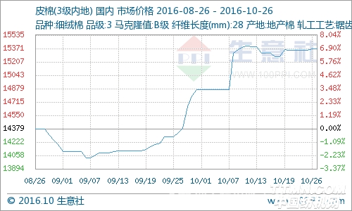 根據生意社價格監測顯示,10月26日,國內棉花價格呈現走穩態勢,目前3128B級皮棉價格在15300-15425元/噸,較月初上漲3.36%。當日鄭棉1701合約收跌,截止10月26日收盤報14925元/噸,較月初結算價15100元/噸下跌1.16%。10月26日,受困于收割壓力和對出口需求疲弱的擔憂,ICE期棉連續第六日下跌,觸及約兩周最低水平,12月期棉合約收跌0.41%,報每磅68.49美分。