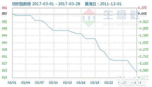 從生意社紡織指數(shù)走勢(shì)來(lái)看,2017年2月中旬開(kāi)始紡織市場(chǎng)停止了上漲的腳步,經(jīng)過(guò)短暫的窄幅震蕩,3月份開(kāi)啟單邊下滑模式,截止3月28日紡織指數(shù)922點(diǎn),較月初957點(diǎn)下跌了3.66%,同比上漲了26.30%,較周期內(nèi)最高點(diǎn)1074點(diǎn)(2013-02-19)下降了14.15%,較2016年02月17日最低點(diǎn)715點(diǎn)上漲了28.95%。