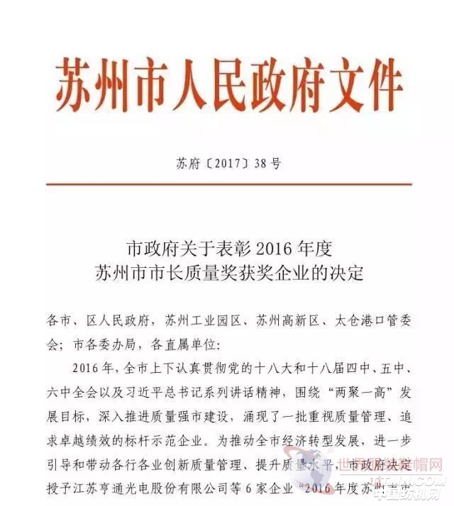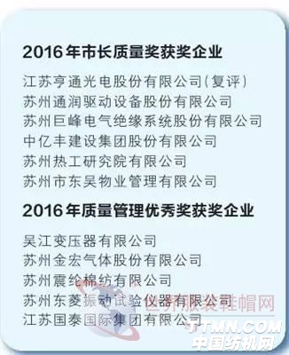 蘇州市質量管理優秀獎由市政府設立。據悉,在《市政府關于表彰2016年度蘇州市市長質量獎獲獎企業的決定》中,2016年全市共5家單位獲蘇州市質量管理優秀獎,公司作為吳江區唯一一家入選參評的紡織企業,榜上有名。