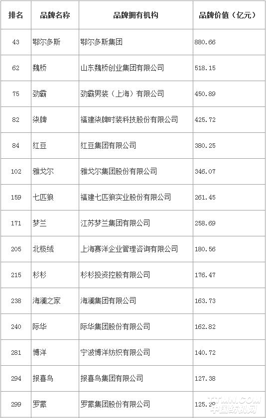 占據(jù)榜單前50名的紡織服裝企業(yè)僅有鄂爾多斯一家,其以880.66億元的品牌價值位居排行榜第43位,紡織服裝行業(yè)第一名,且為唯一具有世界影響力的紡織服裝品牌。