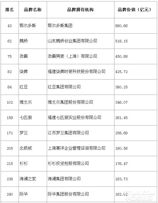 占據榜單前50名的紡織服裝企業僅有鄂爾多斯一家,其以880.66億元的品牌價值位居排行榜第43位,紡織服裝行業第一名,且為唯一具有世界影響力的紡織服裝品牌。?