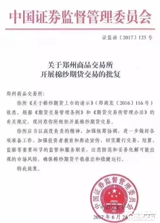 6月30日消息,證監會已于近日批準鄭州商品交易所開展棉紗期貨交易,將在年內上市!