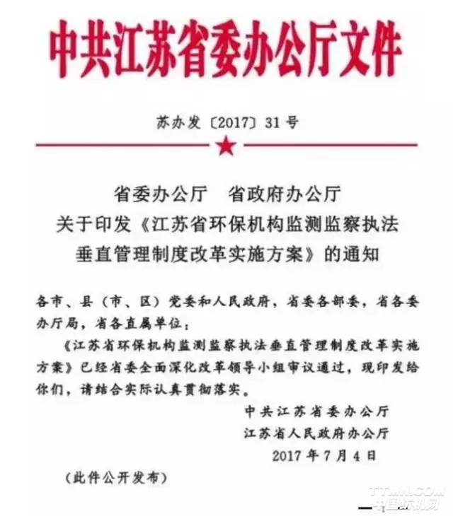 江蘇省環(huán)保機(jī)構(gòu)監(jiān)測(cè)監(jiān)察執(zhí)法垂直管理制度改革實(shí)施方案出臺(tái),強(qiáng)調(diào)區(qū)市環(huán)保局雙重管理