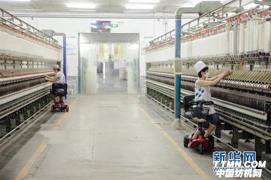 7月14日,山東淄博一家紡織公司女工駕乘電動車在車間巡查織機運行情況。日前,淄博這家紡織公司為紡織工人配備電動車代步,減少員工體力消耗,受到員工們的歡迎。