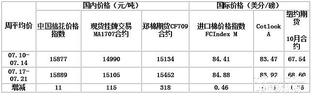 同期,受美棉出口數據較佳、美元指數下跌影響,國際棉花市場價格出現上漲。7月21日,ICE棉花期貨近期合約收于69.14美分/磅,全周共上漲2.20美分,CotlookA指數收于85.05美分/磅,累計上漲2.85美分。