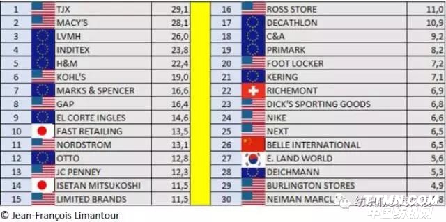 全球30大時尚銷售商(單位:十億美元)