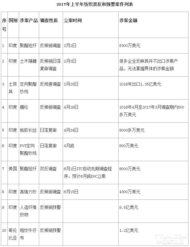 據業內人士分析,2017年上半年我國紡織業遇到的貿易救濟案件呈現出幾個突出特征:一是印度再次進入案件高發期,上半年的8起案件中有6起來自印度。預警案件中的人造纖維織物反傾銷調查涉案金額高達9.5億美元,對企業出口影響較大;二是美國案件重出江湖。近年來紡織服裝領域案件的發起國多集中在發展中國家。但是今年上半年,美國對我聚酯短纖發起了雙反調查,是時隔6年后再次對紡織服裝行業發起原審調查,其背后的發展趨勢值得關注;三是化纖產品涉案集中,10起案件中有8起針對化纖產品,分別是:聚酯短纖2起,人造纖維、聚酯長絲紗線、腈綸織物、粘膠長絲、部分取向絲(POY)和高強力紗各1起。尤其是聚酯短纖類產品,是貿易救濟調查的重災區。