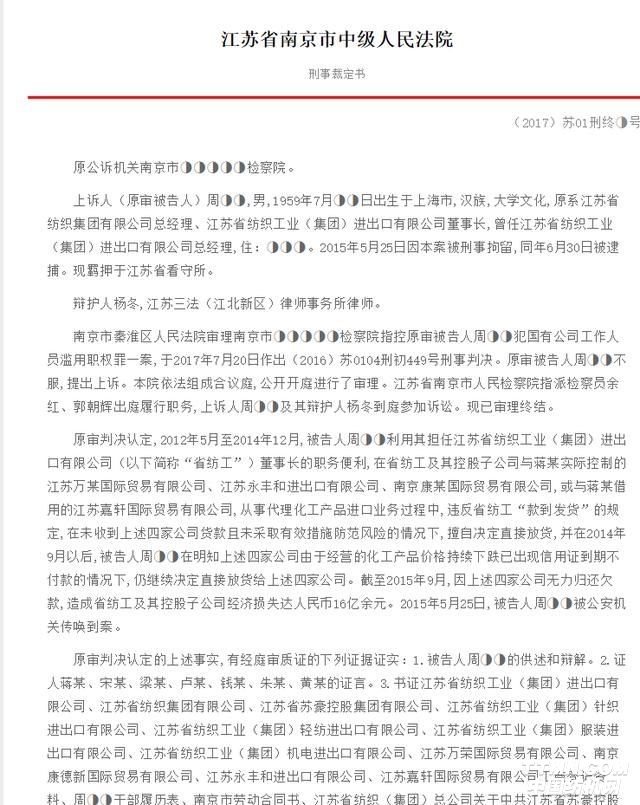 上述二審刑事裁定書顯示,上訴人(原審被告人)周曉炎,男,1959年7月出生于上海市,漢族,大學(xué)文化,原系江蘇省紡織集團(tuán)有限公司總經(jīng)理、江蘇省紡織工業(yè)(集團(tuán))進(jìn)出口有限公司董事長,曾任江蘇省紡織工業(yè)(集團(tuán))進(jìn)出口有限公司總經(jīng)理。2015年5月25日,因?yàn)E用職權(quán)一案被刑事拘留,同年6月30日被逮捕。