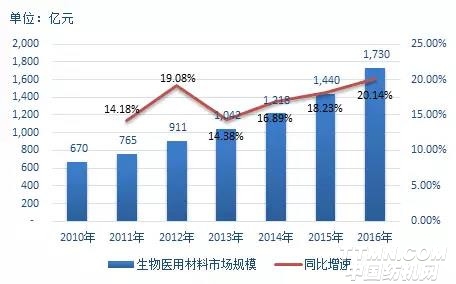 我國生物醫用材料研制和生產迅速發展,初具規模,現已經成為一個新興產業,總產值的增長率遠高于國民經濟平均發展速度。目前,我國生物醫用材料在臨床應用中主要用作醫療器械,已成為整個醫療器械產業的重要基礎,其產品約占醫療器械市場的4-5成。據統計數據顯示,2010年我國生物醫用材料市場規模約670億元,發展到2016年增長至1,730億元左右,增長了158.21%;近幾年增速呈加快趨勢,目前年增長已達20%左右,保守估計至2019年,我國生物醫用材料市場規模可達6,000億元左右。