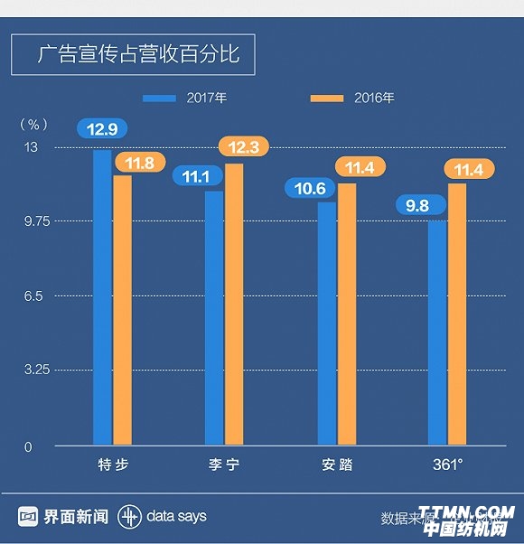 配合以跑步為主的專業運動戰略,2017年特步贊助40場賽事,是贊助最多馬拉松賽事的本土品牌,廣告宣傳費用占比高居首位。安踏這一數字有所下降,該公司表示是收益顯著增加所致。