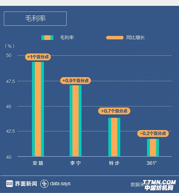 此外,李寧和特步的毛利率分別達到47.1%和43.9%。361°是唯一下跌的品牌,以41.8%的毛利率墊底。