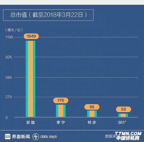 截至2018年3月22日,安踏的總市值達到約1049億港元,僅次于國際巨頭耐克和阿迪達斯,位列全球運動品牌行業第三。與此同時,安踏的市值是李寧的6倍,特步的11倍,361°的20倍。