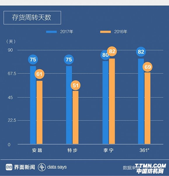 安踏的平均存貨周轉天數從2016年61天上升至75天,對此,安踏稱原因在于集團特意延后產品交付至店鋪,以滿足2018年2月農歷新年的銷售。特步和361°的存貨周轉天數亦有不小的增幅,由于庫存結構改善,李寧下降2天。