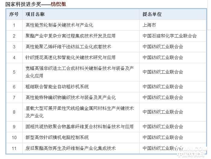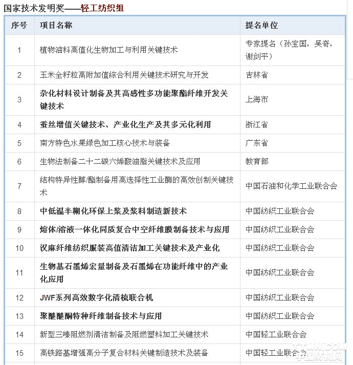 國(guó)家科學(xué)技術(shù)獎(jiǎng)勵(lì)工作辦公室發(fā)布公告,2018年度國(guó)家科學(xué)技術(shù)獎(jiǎng)提名工作已結(jié)束,共收到有關(guān)單位和專家提名的國(guó)家自然科學(xué)獎(jiǎng)項(xiàng)目272項(xiàng),技術(shù)發(fā)明獎(jiǎng)項(xiàng)目306項(xiàng)(通用項(xiàng)目247項(xiàng),專用項(xiàng)目59項(xiàng)),科學(xué)技術(shù)進(jìn)步獎(jiǎng)項(xiàng)目913項(xiàng)(通用項(xiàng)目793項(xiàng),專用項(xiàng)目120項(xiàng))。其中,紡織行業(yè)共有19項(xiàng)獲提名。