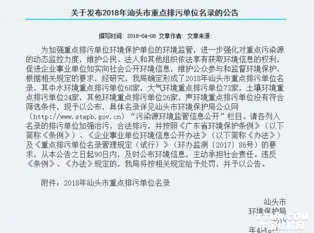 與此同時,汕頭市環保局于2018年4月8日公布汕頭市2018年環保重點監控名單,為加強重點排污單位環境保護單位的環境監管,進一步強化對重點污染源的動態監控力度,維護公民、法人和其他組織依法享有獲取環境信息的權利,促進企業事業單位如實向社會公開環境信息,維護公眾參與和監督環境保護,根據相關規定的要求,經研究,我局確定形成了2018年汕頭市重點排污單位名錄,其中水環境重點排污單位68家,大氣環境重點排污單位73家,土壤環境重點排污單位24家,其他環境重點排污單位26家。