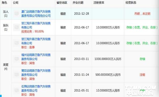 而施養(yǎng)市把多數(shù)汽車銷售公司都放在兒子名下。天眼查顯示,2014年10月27日,施華霖退出福州遠(yuǎn)翔斯巴魯公司法人,12月24日退出石獅遠(yuǎn)翔斯巴魯公司法人,12月30日放棄莆田遠(yuǎn)翔斯巴魯公司法人。兩個(gè)月內(nèi)賣了三家公司,而沒(méi)有賣身的廈門分公司也被注銷。