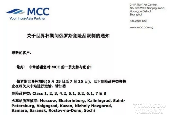 由于即將到來的2018俄羅斯世界杯,自2018年5月25日至2018年7月25日期間,俄羅斯采取加強安全的措施。2018年5月18日至2018年7月25日期間到達俄羅斯港口,危險品運輸將受到限制。船公司MCC已發出通知,請有運輸下列貨物的外貿、貨代人密切注意!