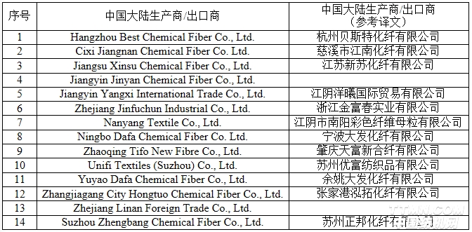 2018年5月24日,美國商務部發布公告稱,對進口自中國大陸、印度、韓國、中國臺灣地區的細旦滌綸短纖(Fine Denier Polyester Staple Fiber)作出反傾銷終裁:(1)中國大陸強制應訴企業Jiangyin Hailun Chemical Fiber Co. Ltd.傾銷率為72.22%、江陰市華宏化纖有限公司(Jiangyin Huahong Chemical Fiber Co. Ltd.)傾銷率為65.17%、中國大陸其他生產商/出口商傾銷率為103.06%。14家獲得單獨稅率的企業(詳見下表)傾銷率為上述兩家強制應訴企業傾銷率的平均值即68.70%;(2)印度強制應訴企業Reliance Industries Limited、Bombay Dyeing & Manufacturing Company Limited及印度其他生產商/出口商傾銷率均為21.43%;(3)韓國強制應訴企業Toray Chemical Korea Inc.傾銷率為0%、Down Nara Co., Ltd.和Huvis Corporation傾銷率為45.23%、韓國其他生產商/出口商傾銷率為30.15%;(4)臺灣地區強制應訴企業Tainan Spinning Co., Ltd.傾銷率為0%、Far Eastern Textile Ltd.傾銷率為48.86%、臺灣地區其他生產商/出口商傾銷率為24.43%。本案涉及美國協調關稅稅號5503.20.0025項下產品。美國國際貿易委員會(USITC)預計將于2018年7月9日對本案作出反傾銷產業損害終裁。