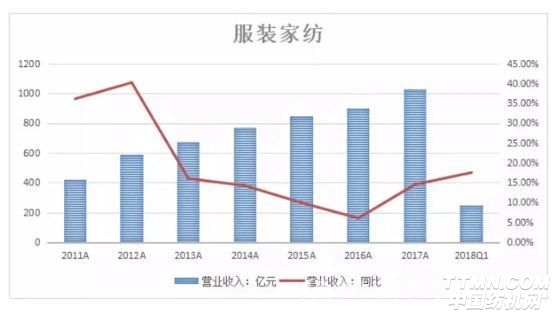 根據(jù)2017年及2018年第一季度我國服裝家紡消費零售額來看,其增速相比2016年有明顯的改善趨勢,這也就說明終端需求回暖了。