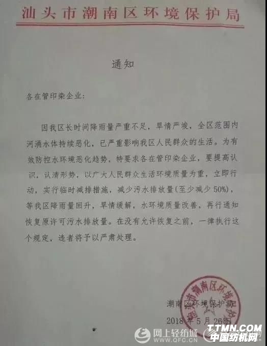 5月26日,汕頭市潮南區(qū)環(huán)境保護(hù)局發(fā)出通知,因旱情嚴(yán)重,全區(qū)范圍內(nèi)河涌水體持續(xù)惡化,為有效防控水環(huán)境惡化趨勢(shì),特要求印染企業(yè)實(shí)行臨時(shí)減排措施,至少減少50%的污水排放量,等水環(huán)境質(zhì)量改善,再恢復(fù)原許可污水排放量。