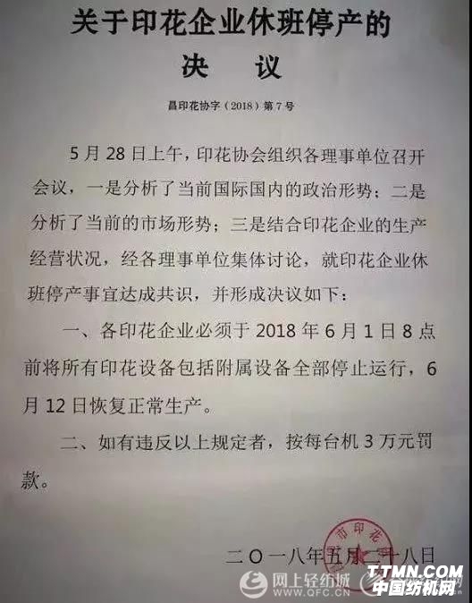 5月28日,昌邑印花協(xié)會(huì)召開(kāi)會(huì)議決定,各印花企業(yè)必須于2018年6月1日8點(diǎn)前將所有印花設(shè)備包括附屬設(shè)備全部停止運(yùn)行,6月12日恢復(fù)正常生產(chǎn),違反者每臺(tái)機(jī)器罰款3萬(wàn)元。
