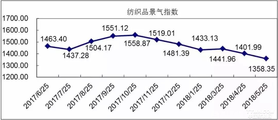 上圖為中國柯橋紡織品總景氣指數圖,2018年5月份總景氣指數收于1358.35點,較年初、三月、四月均有所下跌。