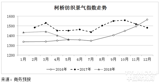 2018年5月份柯橋紡織景氣指數為1358.35點,環比下降3.1%。其中,服裝面料類指數1667.33點,環比下降4.7%;原料類指數1118.89點,環比下降4.6%;坯布類指數1174.71點,環比下降2.4%;家紡類指數1283.94點,環比上漲3.1%;服飾輔料類指數2784.68點,環比上漲0.2%。近期內需持續偏弱,夏季產品銷量下降,秋季品種訂單不足,預計后期柯橋紡織景氣指數將繼續下行。
