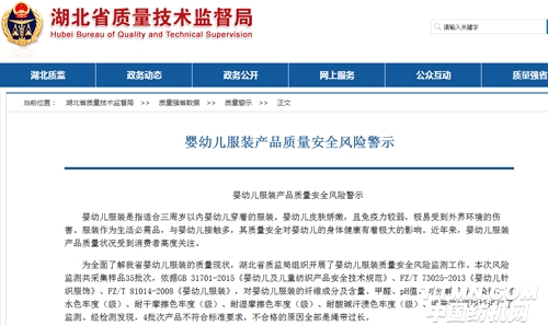 6月11日,湖北省質監局官網發布嬰幼兒服裝產品質量安全風險警示(以下簡稱風險警示)。