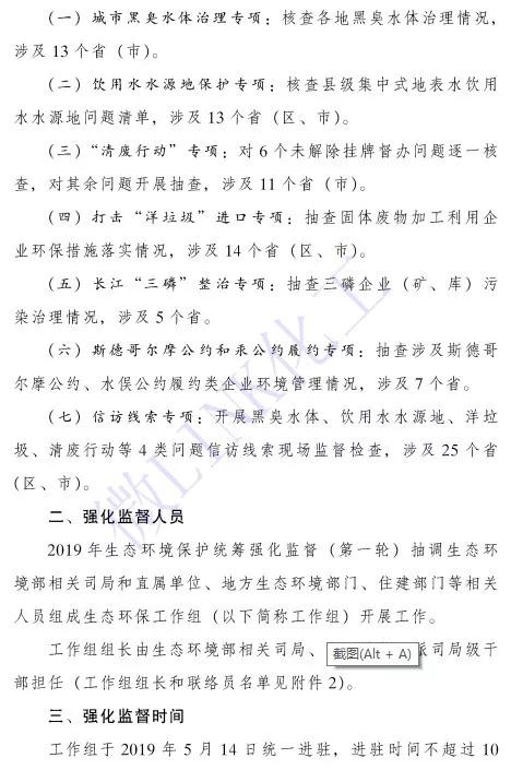 5月9日,生態環境部辦公廳加急發布《關于開展2019年生態環境保護統籌強化監督(第一輪)工作的通知》指出,新一輪的環保大督查將涉及全國25個省和直轄市,包括7大專項內容。