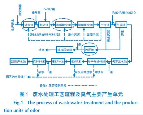 常州某印染公司主要產品為針織品,該公司于2013年投資建設了一套印染污水回用處理設施,在印染廢水處理過程中,部分廢水處理單元會產生惡臭氣體。根據對廢水處理站現場勘察,臭氣主要來源于調節池、水解酸化池和污泥池三個單元。為響應政府的號召,提高周圍居民的生活、工作環境質量,須安裝廢氣收集和處理設施,以臭氣達標排放。具體廢水處理工藝流程及臭氣控制單元見圖1。